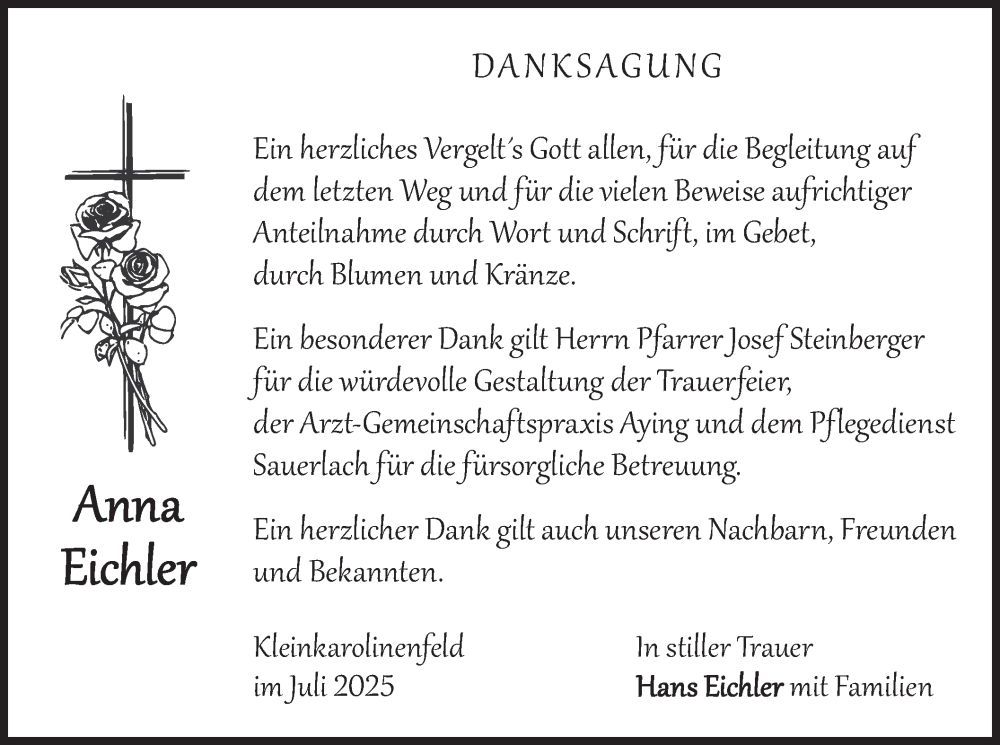 Hier finden Sie alle Traueranzeigen aus der Zeitung, die bisher für Anna Eichler erschienen sind. Weitere Traueranzeigen, die in der Zeitung erscheinen, werden hier ebenfalls aufgelistet