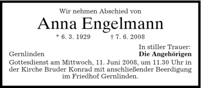 Hier finden Sie alle Traueranzeigen aus der Zeitung, die bisher für Anna Engelmann erschienen sind. Weitere Traueranzeigen, die in der Zeitung erscheinen, werden hier ebenfalls aufgelistet