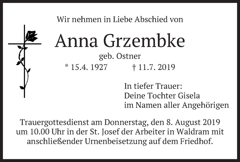 Hier finden Sie alle Traueranzeigen aus der Zeitung, die bisher für Anna Grzembke erschienen sind. Weitere Traueranzeigen, die in der Zeitung erscheinen, werden hier ebenfalls aufgelistet