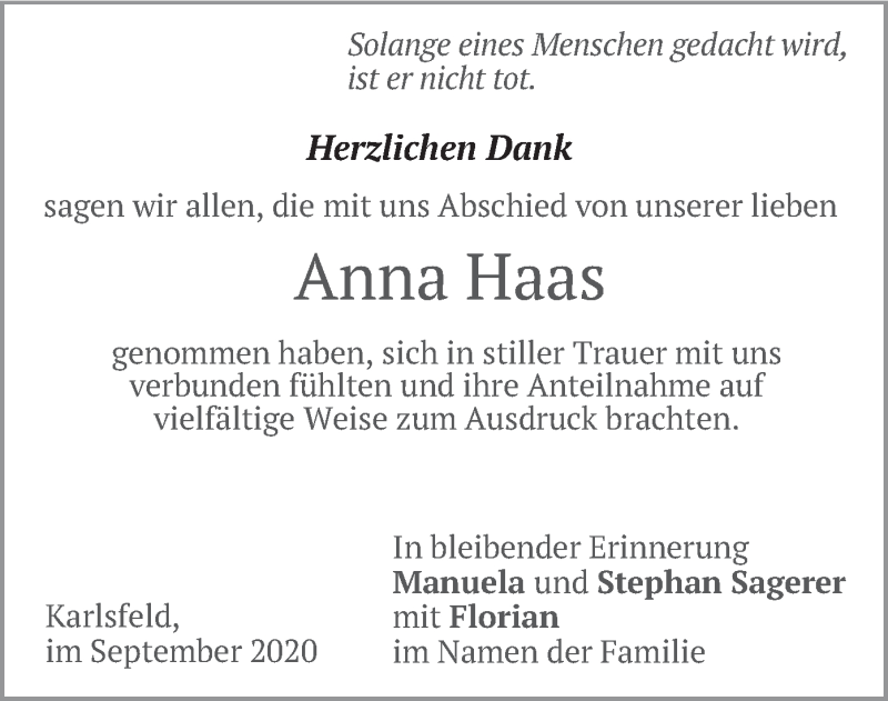 Hier finden Sie alle Traueranzeigen aus der Zeitung, die bisher für Anna Haas erschienen sind. Weitere Traueranzeigen, die in der Zeitung erscheinen, werden hier ebenfalls aufgelistet