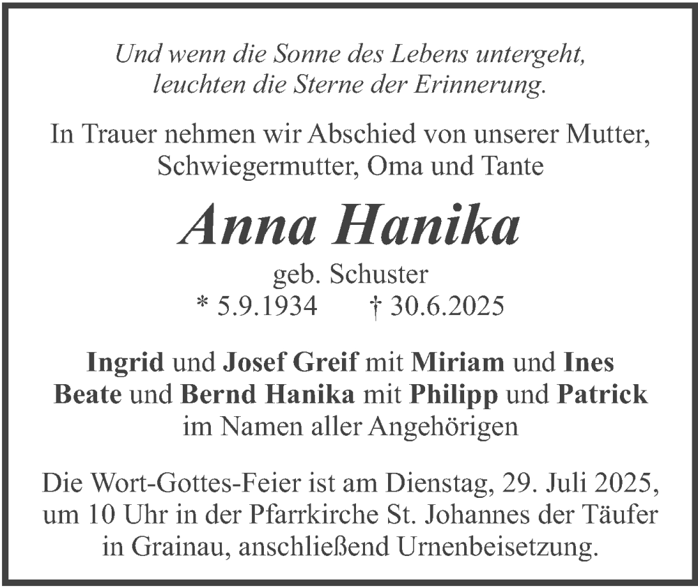 Hier finden Sie alle Traueranzeigen aus der Zeitung, die bisher für Anna Hanika erschienen sind. Weitere Traueranzeigen, die in der Zeitung erscheinen, werden hier ebenfalls aufgelistet