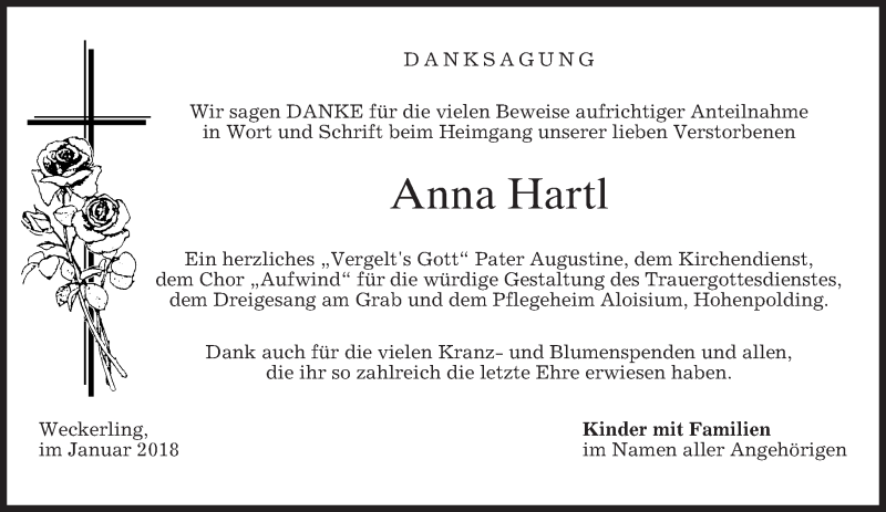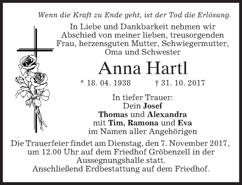 Hier finden Sie alle Traueranzeigen aus der Zeitung, die bisher für Anna Hartl erschienen sind. Weitere Traueranzeigen, die in der Zeitung erscheinen, werden hier ebenfalls aufgelistet