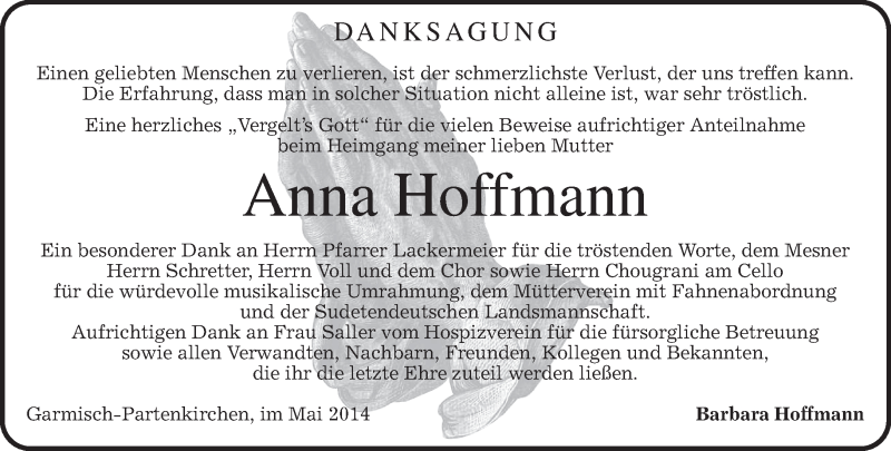 Hier finden Sie alle Traueranzeigen aus der Zeitung, die bisher für Anna Hoffmann erschienen sind. Weitere Traueranzeigen, die in der Zeitung erscheinen, werden hier ebenfalls aufgelistet