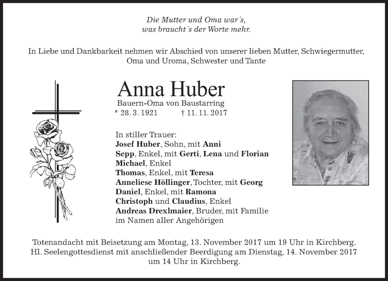Hier finden Sie alle Traueranzeigen aus der Zeitung, die bisher für Anna Huber erschienen sind. Weitere Traueranzeigen, die in der Zeitung erscheinen, werden hier ebenfalls aufgelistet