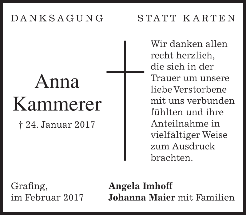 Hier finden Sie alle Traueranzeigen aus der Zeitung, die bisher für Anna Kammerer erschienen sind. Weitere Traueranzeigen, die in der Zeitung erscheinen, werden hier ebenfalls aufgelistet