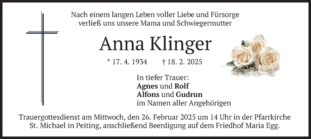 Hier finden Sie alle Traueranzeigen aus der Zeitung, die bisher für Anna Klinger erschienen sind. Weitere Traueranzeigen, die in der Zeitung erscheinen, werden hier ebenfalls aufgelistet