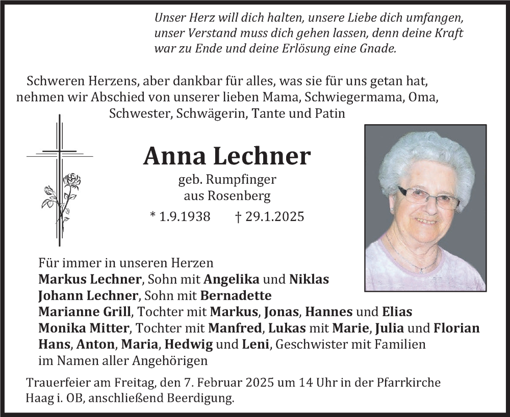 Hier finden Sie alle Traueranzeigen aus der Zeitung, die bisher für Anna Lechner erschienen sind. Weitere Traueranzeigen, die in der Zeitung erscheinen, werden hier ebenfalls aufgelistet