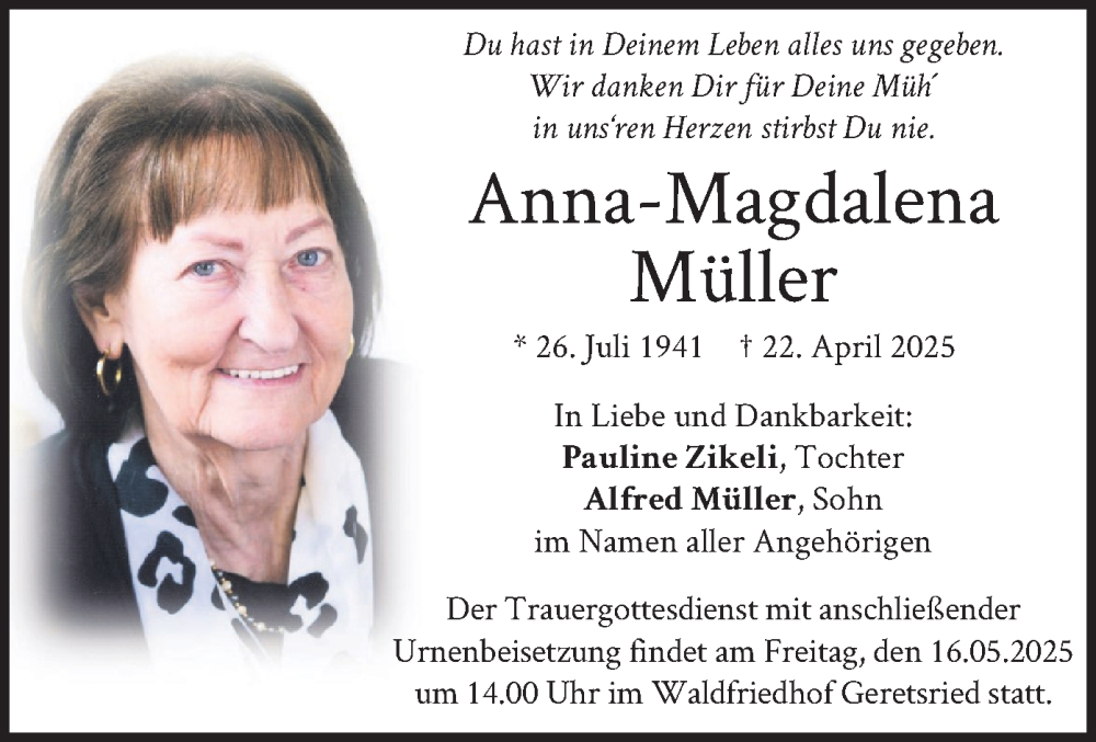 Hier finden Sie alle Traueranzeigen aus der Zeitung, die bisher für Anna-Magdalena Müller erschienen sind. Weitere Traueranzeigen, die in der Zeitung erscheinen, werden hier ebenfalls aufgelistet