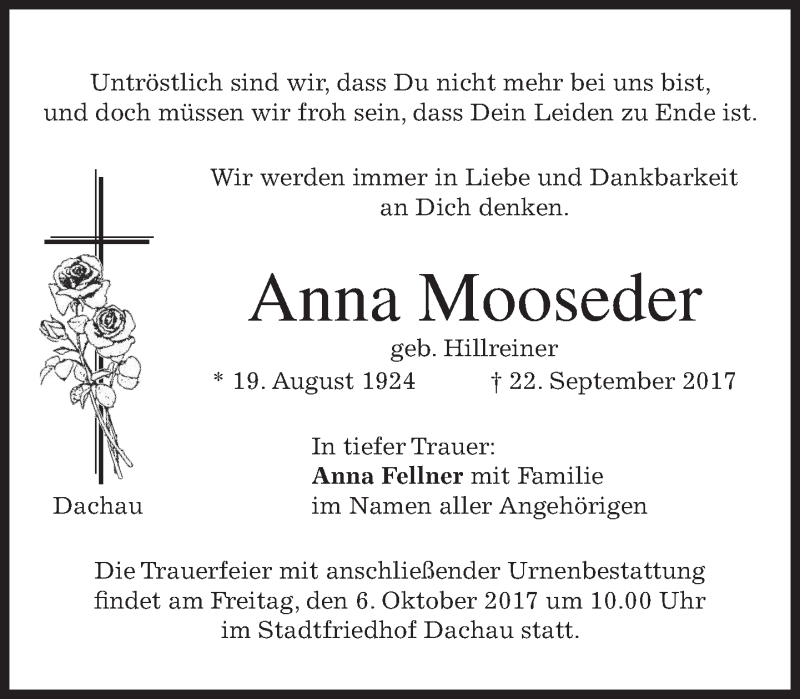 Hier finden Sie alle Traueranzeigen aus der Zeitung, die bisher für Anna Mooseder erschienen sind. Weitere Traueranzeigen, die in der Zeitung erscheinen, werden hier ebenfalls aufgelistet