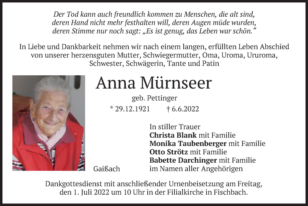 Hier finden Sie alle Traueranzeigen aus der Zeitung, die bisher für Anna Mürnseer erschienen sind. Weitere Traueranzeigen, die in der Zeitung erscheinen, werden hier ebenfalls aufgelistet