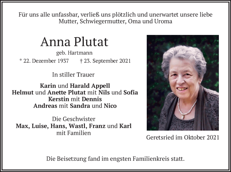 Hier finden Sie alle Traueranzeigen aus der Zeitung, die bisher für Anna Plutat erschienen sind. Weitere Traueranzeigen, die in der Zeitung erscheinen, werden hier ebenfalls aufgelistet