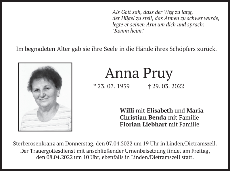 Hier finden Sie alle Traueranzeigen aus der Zeitung, die bisher für Anna Pruy erschienen sind. Weitere Traueranzeigen, die in der Zeitung erscheinen, werden hier ebenfalls aufgelistet