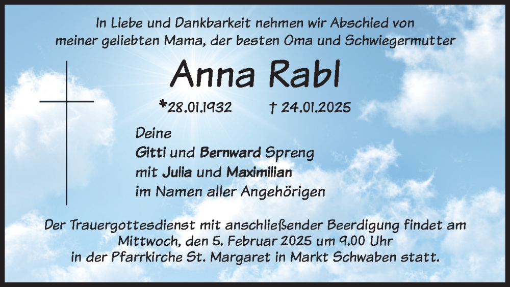 Hier finden Sie alle Traueranzeigen aus der Zeitung, die bisher für Anna Rabl erschienen sind. Weitere Traueranzeigen, die in der Zeitung erscheinen, werden hier ebenfalls aufgelistet