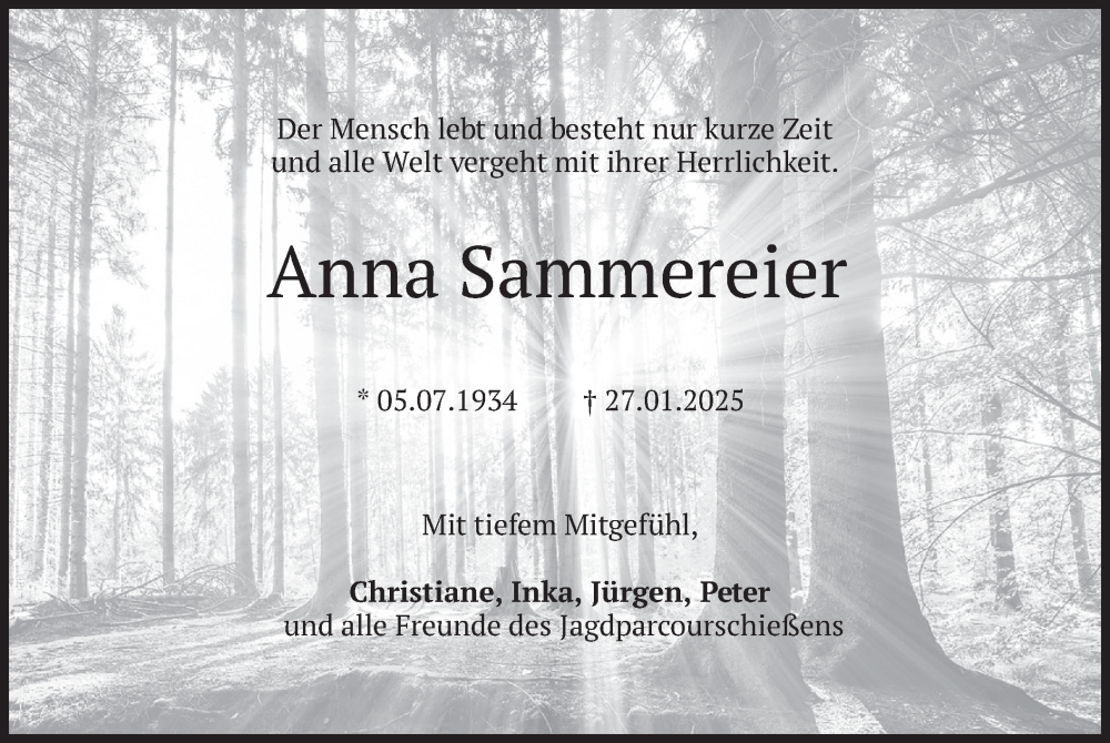 Hier finden Sie alle Traueranzeigen aus der Zeitung, die bisher für Anna Sammereier erschienen sind. Weitere Traueranzeigen, die in der Zeitung erscheinen, werden hier ebenfalls aufgelistet