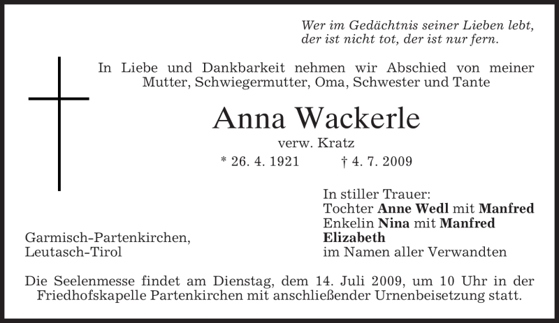 Hier finden Sie alle Traueranzeigen aus der Zeitung, die bisher für Anna Wackerle erschienen sind. Weitere Traueranzeigen, die in der Zeitung erscheinen, werden hier ebenfalls aufgelistet
