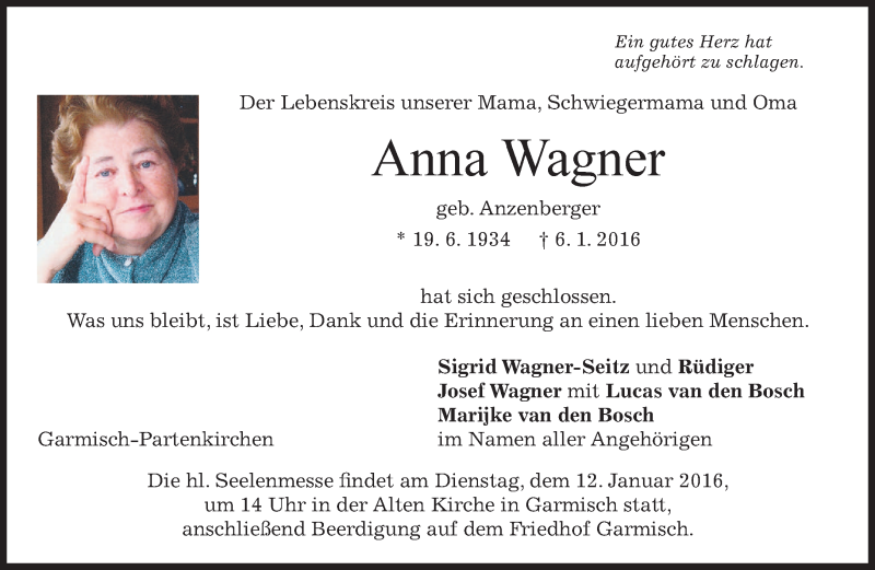 Hier finden Sie alle Traueranzeigen aus der Zeitung, die bisher für Anna Wagner erschienen sind. Weitere Traueranzeigen, die in der Zeitung erscheinen, werden hier ebenfalls aufgelistet
