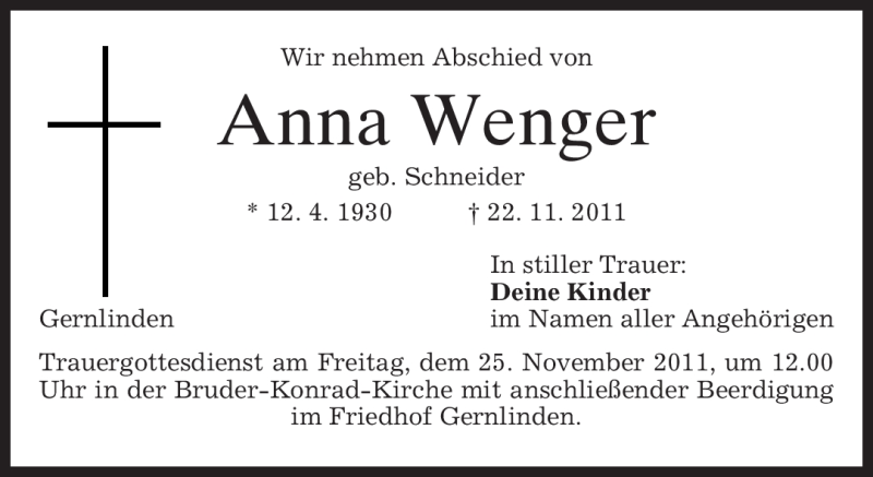 Hier finden Sie alle Traueranzeigen aus der Zeitung, die bisher für Anna Wenger erschienen sind. Weitere Traueranzeigen, die in der Zeitung erscheinen, werden hier ebenfalls aufgelistet