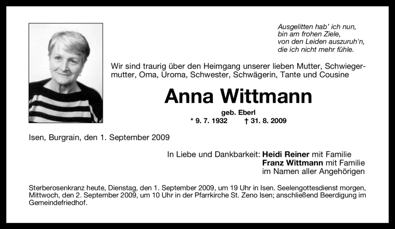 Hier finden Sie alle Traueranzeigen aus der Zeitung, die bisher für Anna Wittmann erschienen sind. Weitere Traueranzeigen, die in der Zeitung erscheinen, werden hier ebenfalls aufgelistet