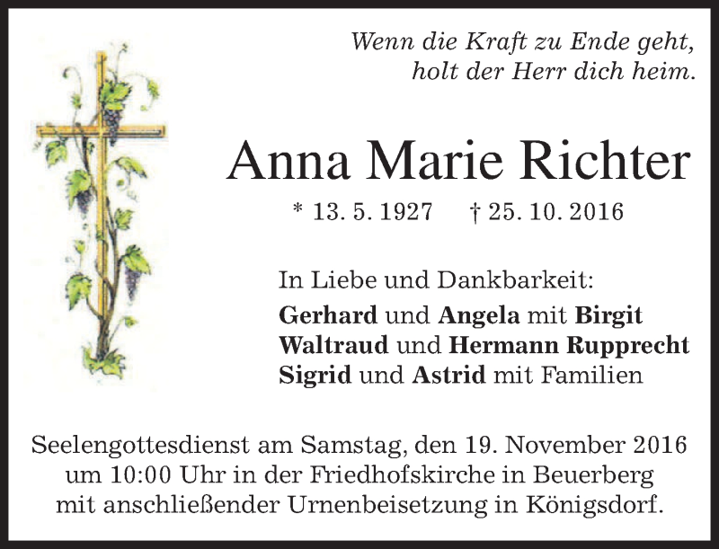 Hier finden Sie alle Traueranzeigen aus der Zeitung, die bisher für Anna Marie Richter erschienen sind. Weitere Traueranzeigen, die in der Zeitung erscheinen, werden hier ebenfalls aufgelistet