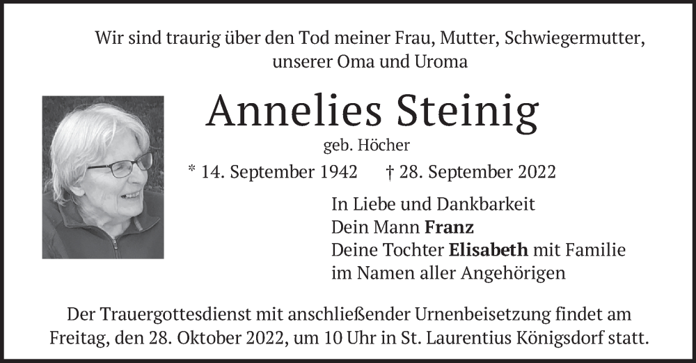 Hier finden Sie alle Traueranzeigen aus der Zeitung, die bisher für Annelies Steinig erschienen sind. Weitere Traueranzeigen, die in der Zeitung erscheinen, werden hier ebenfalls aufgelistet