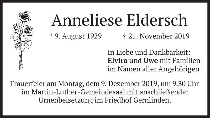 Hier finden Sie alle Traueranzeigen aus der Zeitung, die bisher für Anneliese Eldersch erschienen sind. Weitere Traueranzeigen, die in der Zeitung erscheinen, werden hier ebenfalls aufgelistet