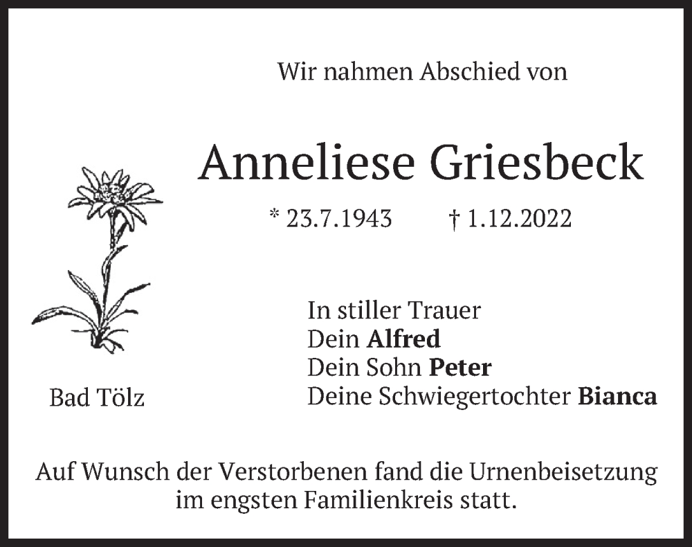 Hier finden Sie alle Traueranzeigen aus der Zeitung, die bisher für Anneliese Griesbeck erschienen sind. Weitere Traueranzeigen, die in der Zeitung erscheinen, werden hier ebenfalls aufgelistet