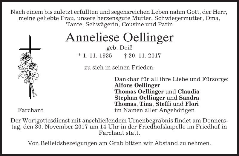 Hier finden Sie alle Traueranzeigen aus der Zeitung, die bisher für Anneliese Oellinger erschienen sind. Weitere Traueranzeigen, die in der Zeitung erscheinen, werden hier ebenfalls aufgelistet
