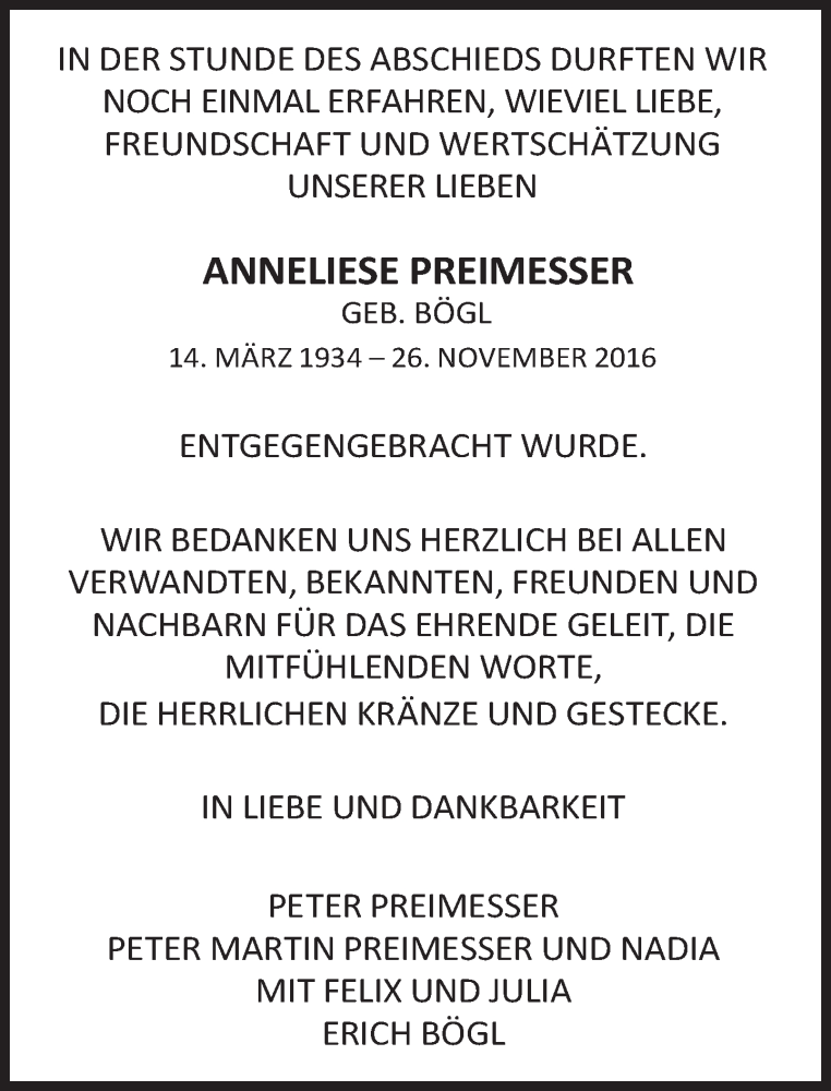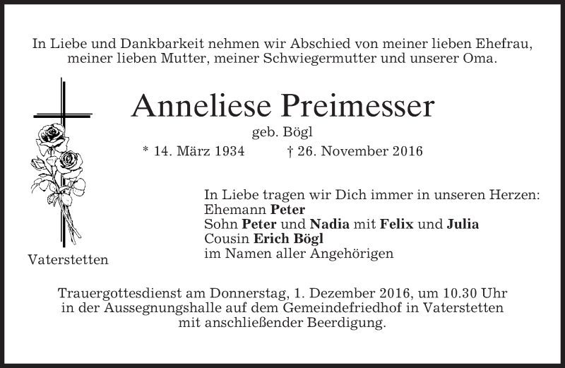 Hier finden Sie alle Traueranzeigen aus der Zeitung, die bisher für Anneliese Preimesser erschienen sind. Weitere Traueranzeigen, die in der Zeitung erscheinen, werden hier ebenfalls aufgelistet