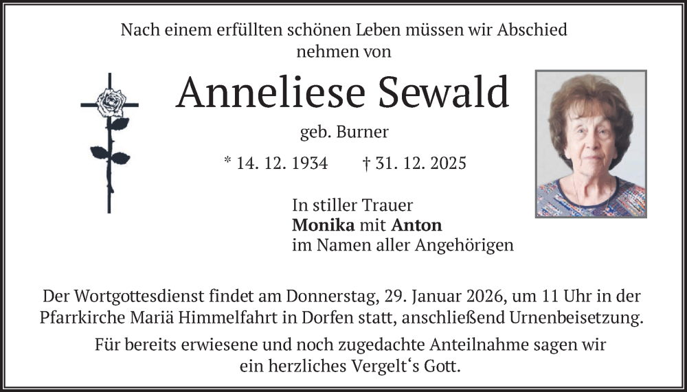 Hier finden Sie alle Traueranzeigen aus der Zeitung, die bisher für Anneliese Sewald erschienen sind. Weitere Traueranzeigen, die in der Zeitung erscheinen, werden hier ebenfalls aufgelistet