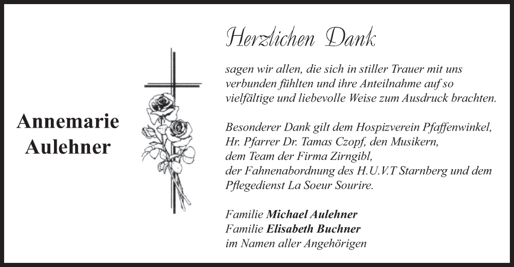 Hier finden Sie alle Traueranzeigen aus der Zeitung, die bisher für Annemarie Aulehner erschienen sind. Weitere Traueranzeigen, die in der Zeitung erscheinen, werden hier ebenfalls aufgelistet