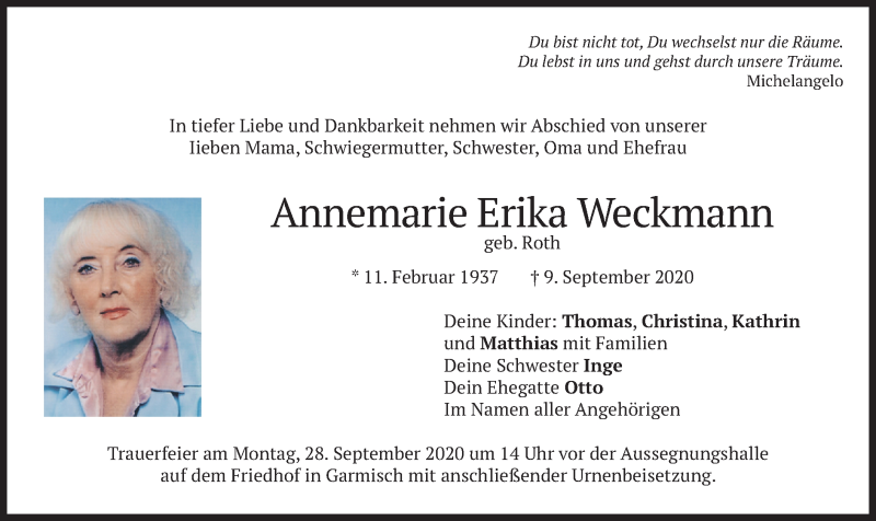 Hier finden Sie alle Traueranzeigen aus der Zeitung, die bisher für Annemarie Erika Weckmann erschienen sind. Weitere Traueranzeigen, die in der Zeitung erscheinen, werden hier ebenfalls aufgelistet