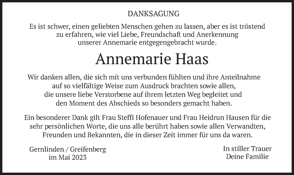 Hier finden Sie alle Traueranzeigen aus der Zeitung, die bisher für Annemarie Haas erschienen sind. Weitere Traueranzeigen, die in der Zeitung erscheinen, werden hier ebenfalls aufgelistet