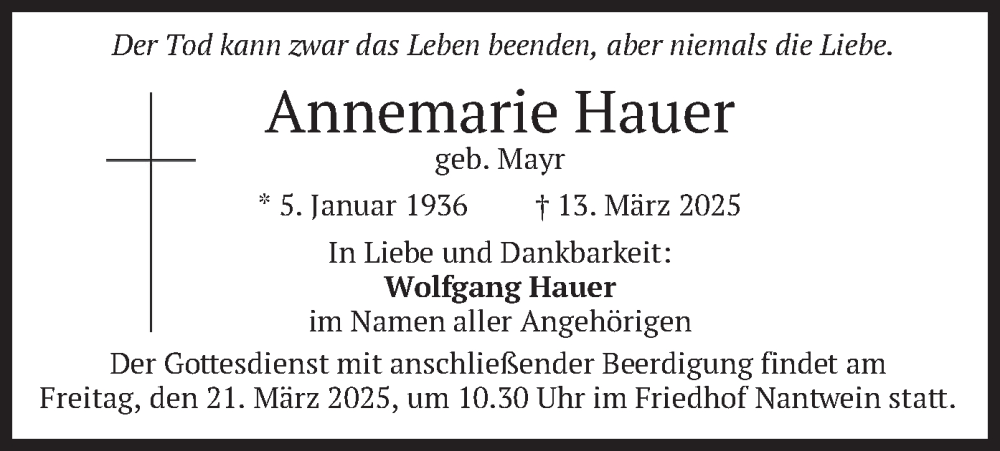 Hier finden Sie alle Traueranzeigen aus der Zeitung, die bisher für Annemarie Hauer erschienen sind. Weitere Traueranzeigen, die in der Zeitung erscheinen, werden hier ebenfalls aufgelistet