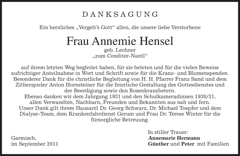 Hier finden Sie alle Traueranzeigen aus der Zeitung, die bisher für Annemie Hensel erschienen sind. Weitere Traueranzeigen, die in der Zeitung erscheinen, werden hier ebenfalls aufgelistet