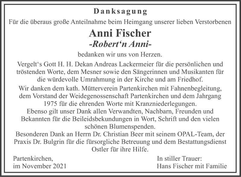 Hier finden Sie alle Traueranzeigen aus der Zeitung, die bisher für Anni Fischer erschienen sind. Weitere Traueranzeigen, die in der Zeitung erscheinen, werden hier ebenfalls aufgelistet