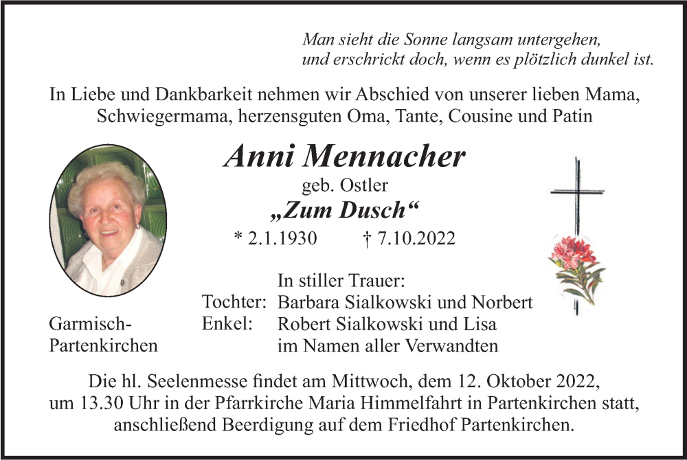 Hier finden Sie alle Traueranzeigen aus der Zeitung, die bisher für Anni Mennacher erschienen sind. Weitere Traueranzeigen, die in der Zeitung erscheinen, werden hier ebenfalls aufgelistet