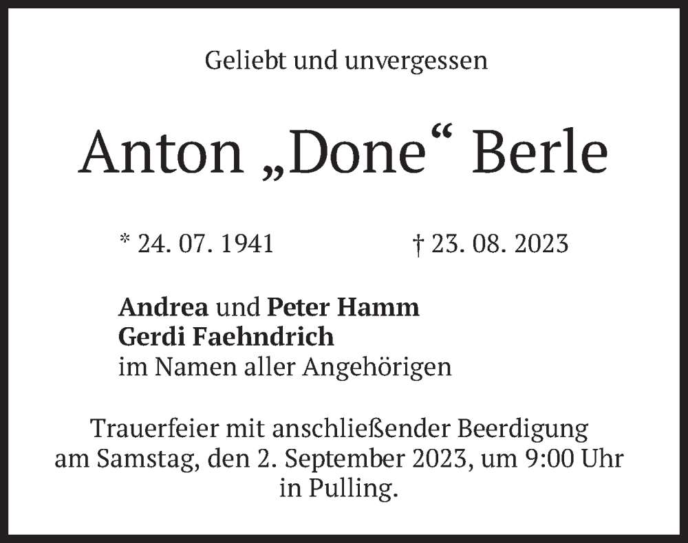 Hier finden Sie alle Traueranzeigen aus der Zeitung, die bisher für Anton Berle erschienen sind. Weitere Traueranzeigen, die in der Zeitung erscheinen, werden hier ebenfalls aufgelistet