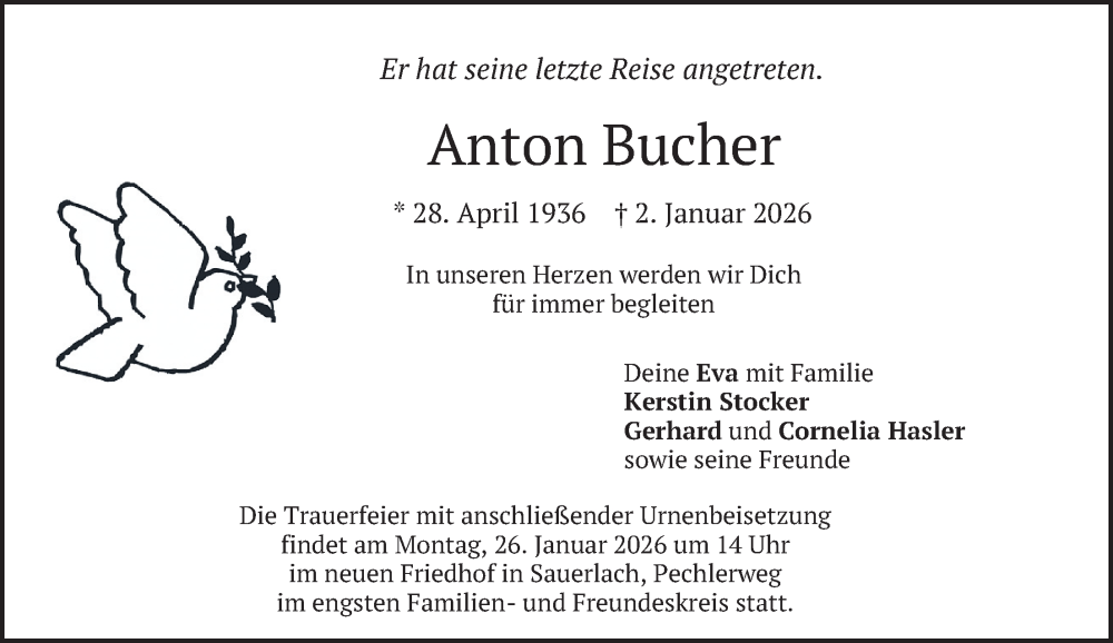 Hier finden Sie alle Traueranzeigen aus der Zeitung, die bisher für Anton Bucher erschienen sind. Weitere Traueranzeigen, die in der Zeitung erscheinen, werden hier ebenfalls aufgelistet