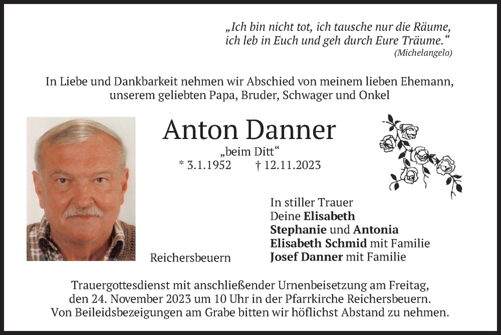 Hier finden Sie alle Traueranzeigen aus der Zeitung, die bisher für Anton Danner erschienen sind. Weitere Traueranzeigen, die in der Zeitung erscheinen, werden hier ebenfalls aufgelistet