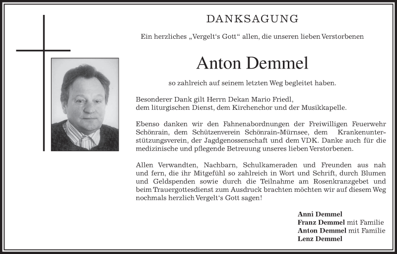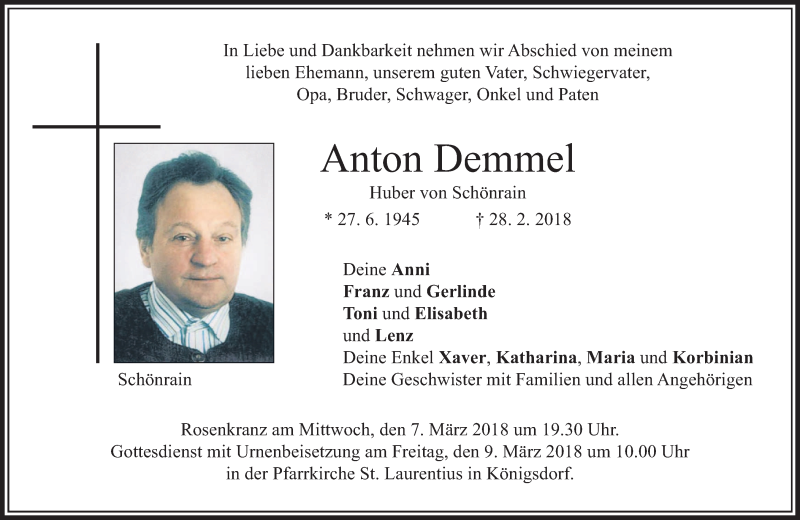Hier finden Sie alle Traueranzeigen aus der Zeitung, die bisher für Anton Demmel erschienen sind. Weitere Traueranzeigen, die in der Zeitung erscheinen, werden hier ebenfalls aufgelistet