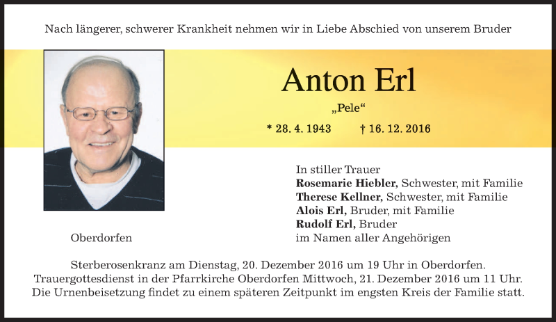 Hier finden Sie alle Traueranzeigen aus der Zeitung, die bisher für Anton Erl erschienen sind. Weitere Traueranzeigen, die in der Zeitung erscheinen, werden hier ebenfalls aufgelistet
