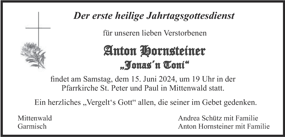 Hier finden Sie alle Traueranzeigen aus der Zeitung, die bisher für Anton Hornsteiner erschienen sind. Weitere Traueranzeigen, die in der Zeitung erscheinen, werden hier ebenfalls aufgelistet