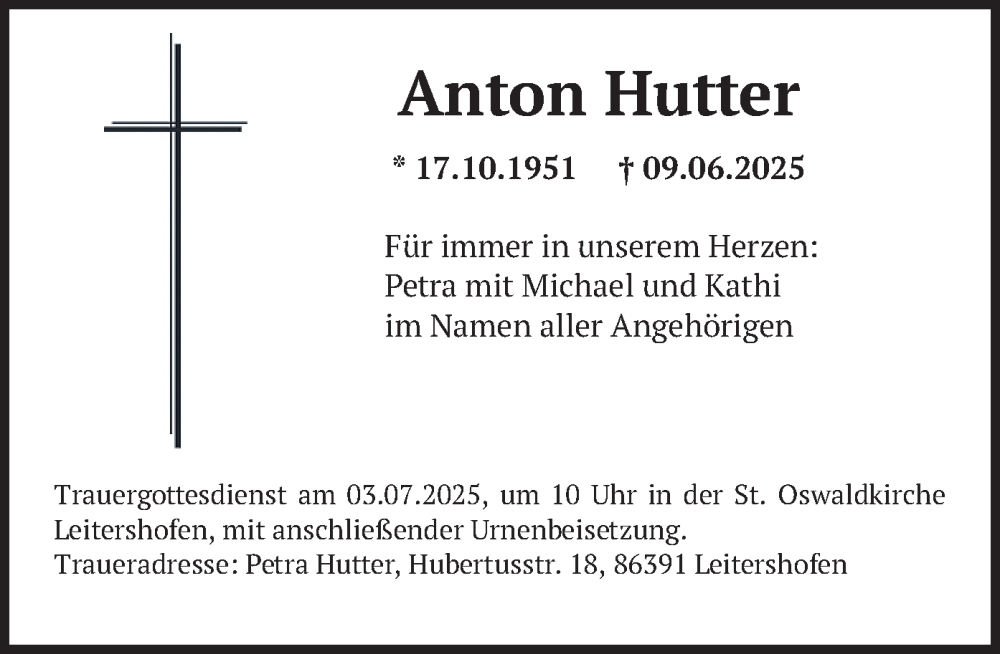 Hier finden Sie alle Traueranzeigen aus der Zeitung, die bisher für Anton Hutter erschienen sind. Weitere Traueranzeigen, die in der Zeitung erscheinen, werden hier ebenfalls aufgelistet