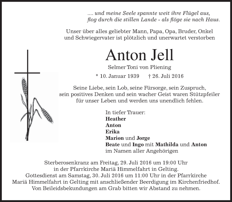 Hier finden Sie alle Traueranzeigen aus der Zeitung, die bisher für Anton Jell erschienen sind. Weitere Traueranzeigen, die in der Zeitung erscheinen, werden hier ebenfalls aufgelistet