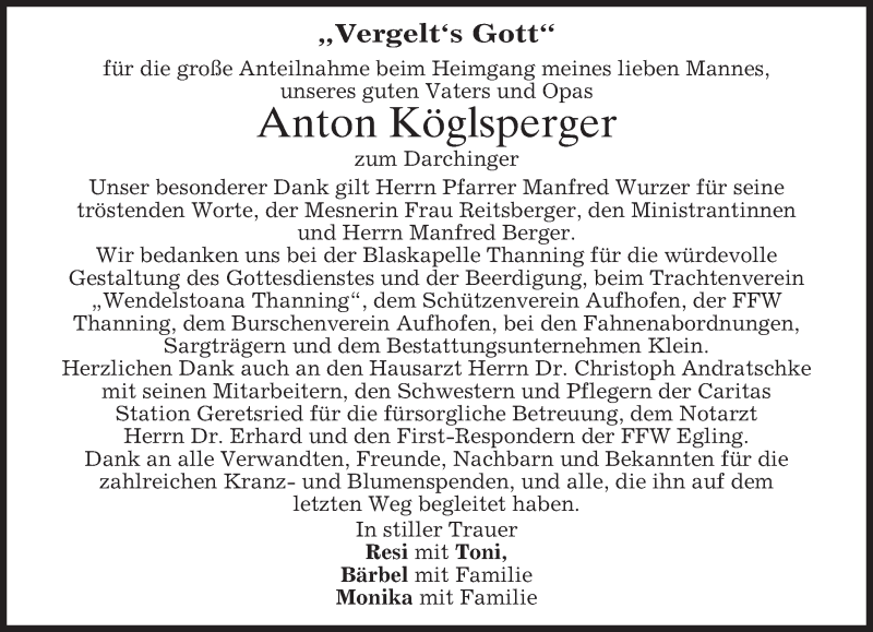 Hier finden Sie alle Traueranzeigen aus der Zeitung, die bisher für Anton Köglsperger erschienen sind. Weitere Traueranzeigen, die in der Zeitung erscheinen, werden hier ebenfalls aufgelistet
