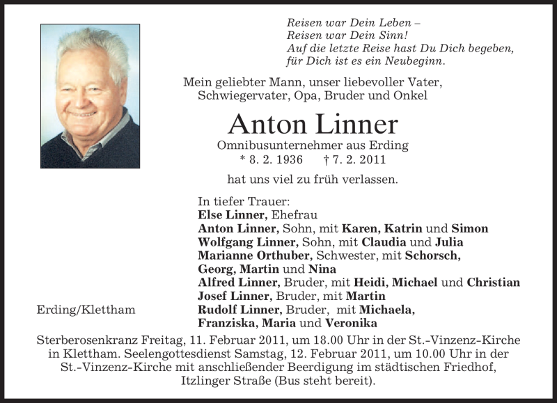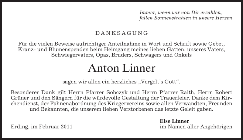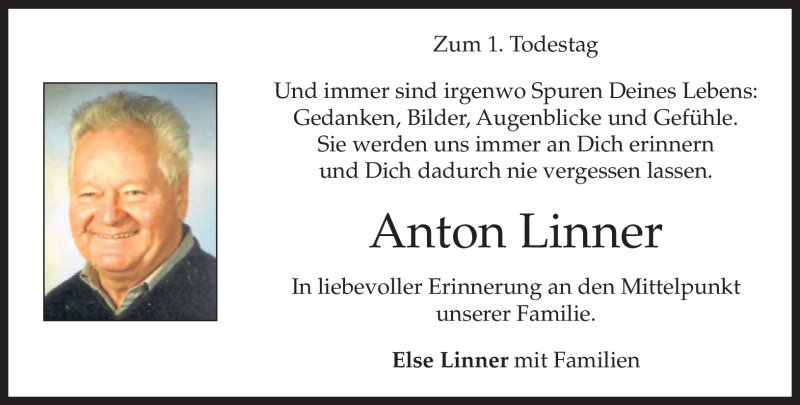 Hier finden Sie alle Traueranzeigen aus der Zeitung, die bisher für Anton Linner erschienen sind. Weitere Traueranzeigen, die in der Zeitung erscheinen, werden hier ebenfalls aufgelistet
