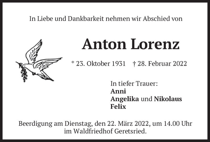 Hier finden Sie alle Traueranzeigen aus der Zeitung, die bisher für Anton Lorenz erschienen sind. Weitere Traueranzeigen, die in der Zeitung erscheinen, werden hier ebenfalls aufgelistet