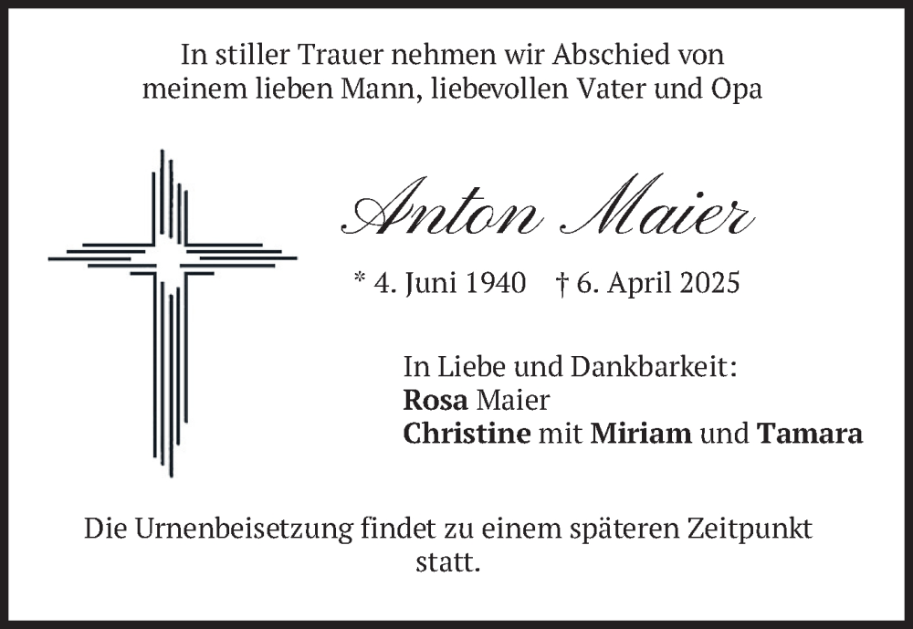 Hier finden Sie alle Traueranzeigen aus der Zeitung, die bisher für Anton Maier erschienen sind. Weitere Traueranzeigen, die in der Zeitung erscheinen, werden hier ebenfalls aufgelistet