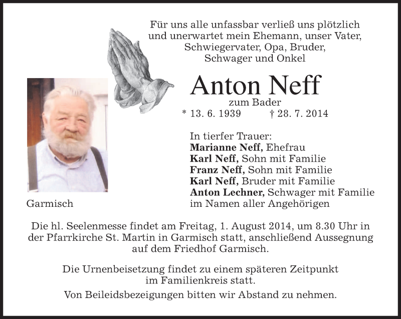 Hier finden Sie alle Traueranzeigen aus der Zeitung, die bisher für Anton Neff erschienen sind. Weitere Traueranzeigen, die in der Zeitung erscheinen, werden hier ebenfalls aufgelistet