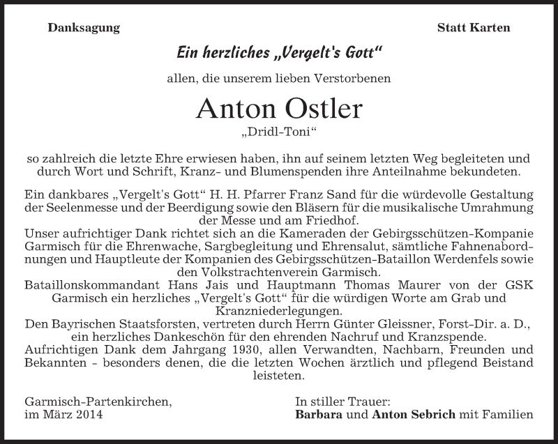 Hier finden Sie alle Traueranzeigen aus der Zeitung, die bisher für Anton Ostler erschienen sind. Weitere Traueranzeigen, die in der Zeitung erscheinen, werden hier ebenfalls aufgelistet